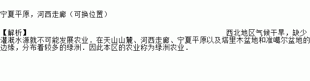 宁夏平原,河西走廊(可换位置) 【解析】西北地区气候干旱,缺少灌溉水源就不可能发展农业.在天山山麓、河西走廊、宁夏平原以及塔里木盆地和准噶尔盆地的边缘,分布着较多的绿洲.因此本区的农业称为绿洲农业.