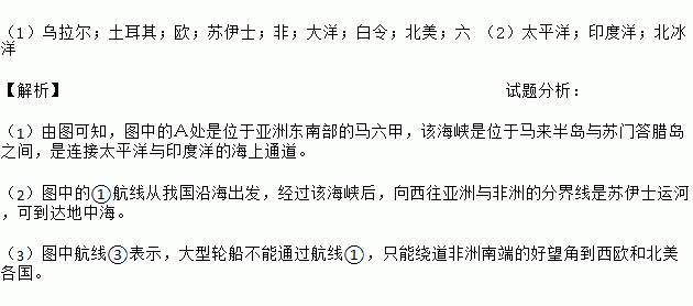 (1)乌拉尔;土耳其;欧;苏伊士;非;大洋;白令;北美;六 (2)太平洋;印度洋;北冰洋 【解析】试题分析: (1)由图可知,图中的A处是位于亚洲东南部的马六甲,该海峡是位于马来半岛与苏门答腊岛之间,是连接太平洋与印度洋的海上通道。 (2)图中的①航线从我国沿海出发,经过该海峡后,向西往亚洲与非洲的分界线是苏伊士运河,可到达地中海。 (3)图中航线③表示,大型轮船不能通过航...