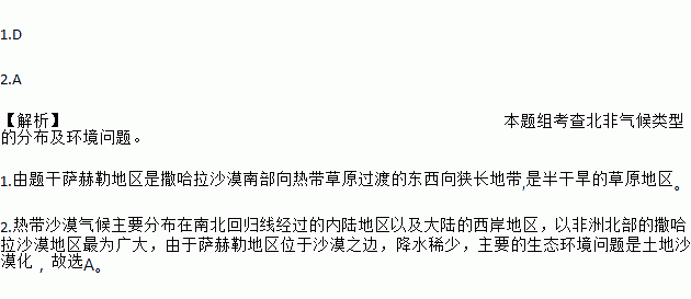1.D 2.A 【解析】本题组考查北非气候类型的分布及环境问题。 1.由题干萨赫勒地区是撒哈拉沙漠南部向热带草原过渡的东西向狭长地带,是半干旱的草原地区。 2.热带沙漠气候主要分布在南北回归线经过的内陆地区以及大陆的西岸地区,以非洲北部的撒哈拉沙漠地区最为广大,由于萨赫勒地区位于沙漠之边,降水稀少,主要的生态环境问题是土地沙漠化,故选A。