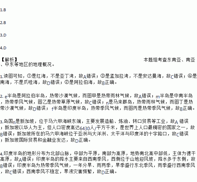 1.B 2.B 3.D 4.D 【解析】本题组考查东南亚、南亚、中东等地区的地理概况。 1.读图可知,①是红海,不是亚丁湾,故A错误;③是孟加拉湾,不是安达曼海,故C错误;④是南海,不是爪哇海,故D错误;②是阿拉伯海,故B正确。 2. e半岛是阿拉伯半岛,热带沙漠气候,而图甲是热带雨林气候,故A错误;m半岛是中南半岛,热带季风气候,图乙是热带草原气候,故C错误;...