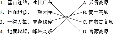 解:青藏高原的地表景观是雪山连绵,冰川广布,黄土高原的地表特征是“千沟万壑,支离破碎”,云贵高原的地表景观是地形崎岖,内蒙古高原的地表景观是地面坦荡.