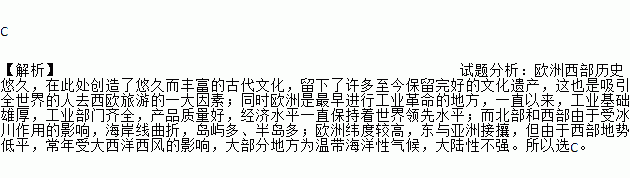C 【解析】试题分析:欧洲西部历史悠久,在此处创造了悠久而丰富的古代文化,留下了许多至今保留完好的文化遗产,这也是吸引全世界的人去西欧旅游的一大因素;同时欧洲是最早进行工业革命的地方,一直以来,工业基础雄厚,工业部门齐全,产品质量好,经济水平一直保持着世界领先水平;而北部和西部由于受冰川作用的影响,海岸线曲折,岛屿多、半岛多;欧洲纬度较高,东与亚洲接攘,但由于西部地势低平,常年受大西洋西风的...