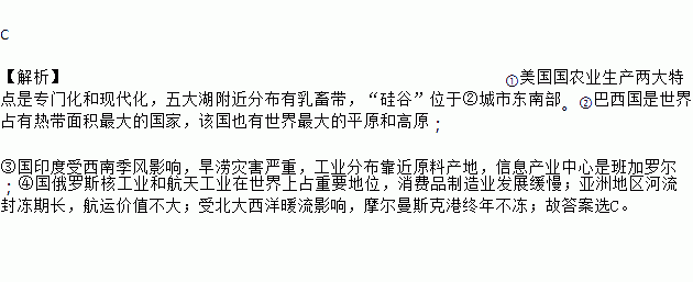 C 【解析】①美国国农业生产两大特点是专门化和现代化,五大湖附近分布有乳畜带,“硅谷”位于②城市东南部。②巴西国是世界占有热带面积最大的国家,该国也有世界最大的平原和高原; ③国印度受西南季风影响,旱涝灾害严重,工业分布靠近原料产地,信息产业中心是班加罗尔;④国俄罗斯核工业和航天工业在世界上占重要地位,消费品制造业发展缓慢;亚洲地区河流封冻期长,航运价值不大;受北大西洋暖流影响,摩尔曼...