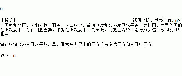 D ¡¾½âÎö¡¿ÊÔÌâ·ÖÎö£ºÊÀ½çÉÏÓÐ200¶à¸ö¹ú¼ÒºÍµØÇø£¬ËüÃǵÄÁìÍÁÃæ»ý¡¢È˿ڶàÉÙ¡¢ÕþÖÎÖÆ¶ÈºÍ¾¼Ã·¢Õ¹Ë®Æ½µÈ²»¾¡Ïàͬ£®ÊÀ½ç¸÷¹úµÄ¾¼Ã·¢Õ¹Ë®Æ½´æÔÚÃ÷ÏÔ²îÒ죬ÒÀ¾Ý¾¼Ã·¢Õ¹Ë®Æ½µÄ¸ßµÍ£¬¿É°ÑÊÀ½ç¸÷¹ú»®·ÖΪ·¢´ï¹ú¼ÒºÍ·¢Õ¹Öйú¼Ò£® ¡¾½âÎö¡¿ ¸ù¾Ý¾¼Ã·¢Õ¹Ë®Æ½µÄ²îÒ죬ͨ³£°ÑÊÀ½çÉϵĹú¼Ò·ÖΪ·¢´ï¹ú¼ÒºÍ·¢Õ¹Öйú¼Ò£® ¹ÊÑ¡£ºD£®