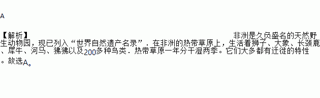 A 【解析】非洲是久负盛名的天然野生动物园,现已列入“世界自然遗产名录”.在非洲的热带草原上,生活着狮子、大象、长颈鹿、犀牛、河马、狒狒以及200多种鸟类.热带草原一年分干湿两季。它们大多都有迁徙的特性 。故选A。