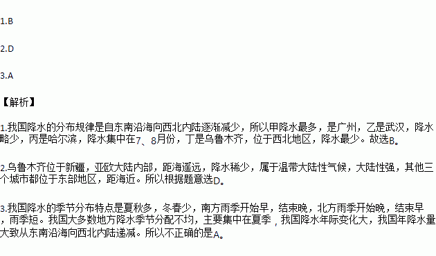 A. 哈尔滨一一甲 B. 武汉一一乙 C. 乌鲁木齐一一丙 D. 广州一一丁