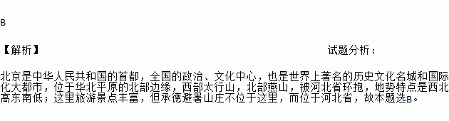B 【解析】试题分析: 北京是中华人民共和国的首都,全国的政治、文化中心,也是世界上著名的历史文化名城和国际化大都市,位于华北平原的北部边缘,西部太行山,北部燕山,被河北省环抱,地势特点是西北高东南低;这里旅游景点丰富,但承德避暑山庄不位于这里,而位于河北省,故本题选B。