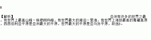 B 【解析】亚洲有许多的世界之最,有世界上最高山峰-珠穆朗玛峰,有世界最大的湖泊-里海,有世界上海拔最高的青藏高原,西西伯利亚平原是亚洲最大的平原,世界最大的平原是亚马孙平原,故选B。