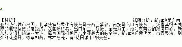 A 【解析】试题分析:新加坡是东南亚的热带城市岛国,北隔狭窄的柔佛海峡与马来西亚紧邻,南扼马六甲海峡东口,凭借其得天独厚的地理位置发展经济,以国际贸易、出口加工、航运、金融为主,成为东南亚的经济中心,新加坡交通和旅游业发达,樟宜国际机场是东南亚最大的航空港,新加坡环境优美,市容整洁,到处鲜花盛开,绿草如茵,林木葱茏,有“花园城市”的美誉。