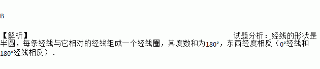 B 【解析】试题分析:经线的形状是半圆,每条经线与它相对的经线组成一个经线圈,其度数和为180°,东西经度相反(0°经线和180°经线相反).关注家乡北京。