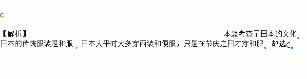 C 【解析】本题考查了日本的文化。日本的传统服装是和服,日本人平时大多穿西装和便服,只是在节庆之日才穿和服。故选C。
