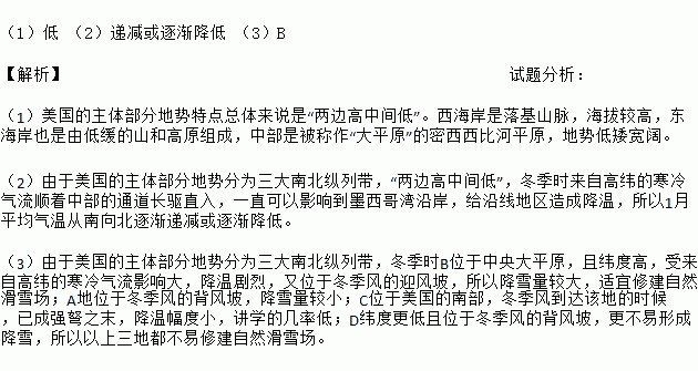 (1)低 (2)递减或逐渐降低 (3)B 【解析】试题分析: (1)美国的主体部分地势特点总体来说是“两边高中间低”。西海岸是落基山脉,海拔较高,东海岸也是由低缓的山和高原组成,中部是被称作“大平原”的密西西比河平原,地势低矮宽阔。 (2)由于美国的主体部分地势分为三大南北纵列带,“两边高中间低”,冬季时来自高纬的寒冷气流顺着中部的通道长驱直入,一直可以影响到墨西哥湾沿岸,给沿线...