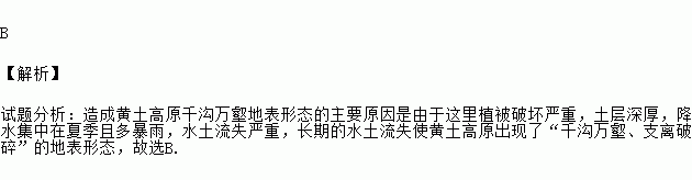 B 【解析】 试题分析:造成黄土高原千沟万壑地表形态的主要原因是由于这里植被破坏严重,土层深厚,降水集中在夏季且多暴雨,水土流失严重,长期的水土流失使黄土高原出现了“千沟万壑、支离破碎”的地表形态,故选B.