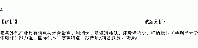 A 【解析】试题分析: 服务外包产业具有信息技术含量高、利润大、资源消耗低、环境污染少、吸纳就业(特别是大学生就业)能力强、国际化水平高等特点.故选项A符合题意,故选A.