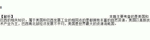 B 【解析】本题主要考查的是美国和巴西的相关知识。属于美国和巴西发展工业的相同点的是都拥有丰富的自然资源。美国以高新技术产业为主,巴西南北部经济发展不平均,美国是世界最大的资源消耗国。