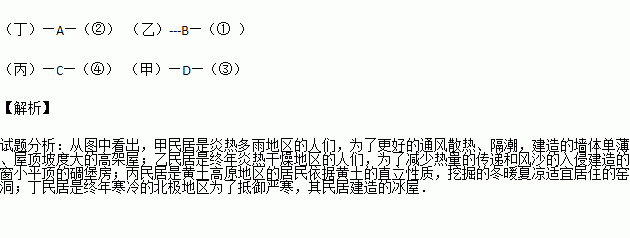 对号入座。世界各地的自然环境与人文环境的差异很大,在长期的发展中,形成了各具特色的民居。认真观察下图中的图片,将各民居与其所在的地区及当地自然环境特点进行对号入座。