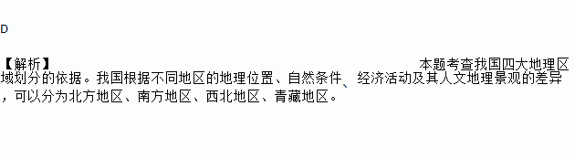 D 【解析】本题考查我国四大地理区域划分的依据。我国根据不同地区的地理位置、自然条件、经济活动及其人文地理景观的差异,可以分为北方地区、南方地区、西北地区、青藏地区。