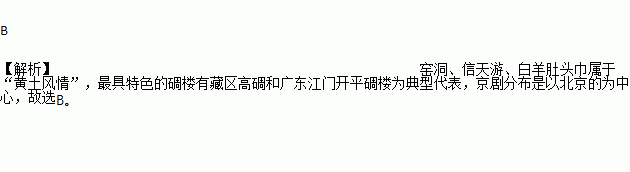 ①窑洞 ②碉楼 ③信天游 ④京剧 ⑤白羊肚头巾