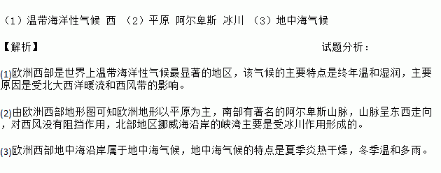(1)温带海洋性气候 西 (2)平原 阿尔卑斯 冰川 (3)地中海气候 【解析】试题分析: (1)欧洲西部是世界上温带海洋性气候最显著的地区,该气候的主要特点是终年温和湿润,主要原因是受北大西洋暖流和西风带的影响。 (2)由欧洲西部地形图可知欧洲地形以平原为主,南部有著名的阿尔卑斯山脉,山脉呈东西走向,对西风没有阻挡作用,北部地区挪威海沿岸的峡湾主要是受冰川作用形成的。 (...