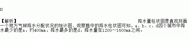 D 【解析】降水量柱状图是直观刻画一个地方气候降水分配状况的统计图.观察题中的降水柱状图可知,a、b、c、d四个城市中降水最少的是a,约400mm,降水最多的是d,降水量在1200~1600mm之间。