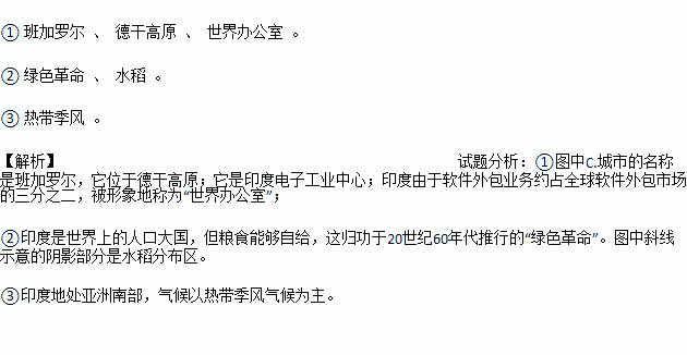 ①图中C.是 (填城市名称),该城市所在地形区是 。目前,印度承接的软件外包业务约占全救软件外包市场的2/3。所以,被形象地称为“ ”。