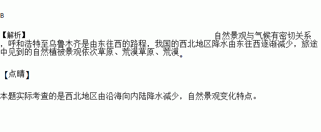 晓明乘火车从呼和浩特出发至乌鲁木齐旅游,他在旅途中能见到的自然景观依次是