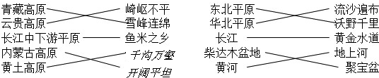 | A、内蒙古高原--崎岖不平 | B、东北平原--雪峰连绵 | C、青藏高原--“世界屋脊” | D、塔里木盆地--“鱼米之乡” |