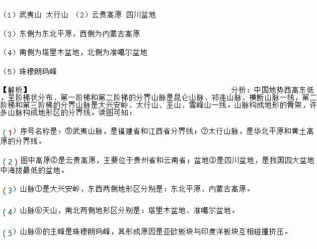 (1)武夷山 太行山 (2)云贵高原 四川盆地 (3)东侧为东北平原,西侧为内蒙古高原 (4)南侧为塔里木盆地,北侧为准噶尔盆地 (5)珠穆朗玛峰 【解析】分析:中国地势西高东低,呈阶梯状分布.第一阶梯和第二阶梯的分界山脉是昆仑山脉、祁连山脉、横断山脉一线,第二阶梯和第三阶梯的分界山脉是大兴安岭、太行山、巫山、雪峰山一线。山脉构成地形的骨架,许多山脉构成地形区的分界线。读图...
