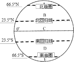 A北寒带;B北温带;C热带;D南温带;E南寒带.