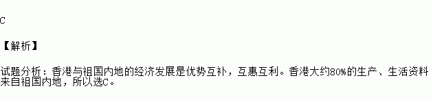 C 【解析】 试题分析:香港与祖国内地的经济发展是优势互补,互惠互利。香港大约80%的生产、生活资料来自祖国内地,所以选C。