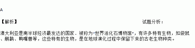A 【解析】试题分析: 澳大利亚是南半球经济最发达的国家.被称为“世界活化石博物馆”,有许多特有生物,如袋鼠、鸸鹋、鸭嘴兽等,这些特有的生物,是在地球演化过程中保留下来的古老生物种类。