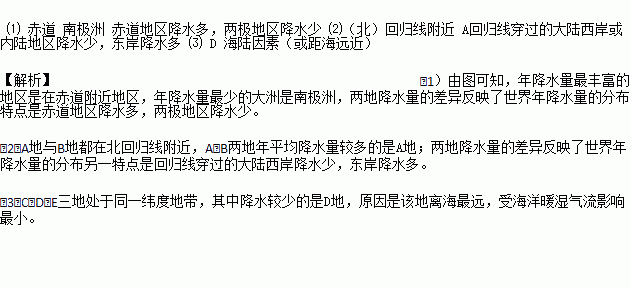 (1)年降水量最丰富的地区是在___(纬线)附近地区。年降水量最少的大洲是____洲。两地降水量的差异反映了世界年降水量的分布特点是__________。
