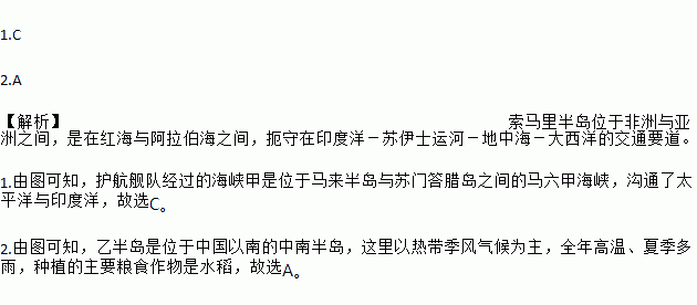 1.C 2.A 【解析】索马里半岛位于非洲与亚洲之间,是在红海与阿拉伯海之间,扼守在印度洋-苏伊士运河-地中海-大西洋的交通要道。 1.由图可知,护航舰队经过的海峡甲是位于马来半岛与苏门答腊岛之间的马六甲海峡,沟通了太平洋与印度洋,故选C。 2.由图可知,乙半岛是位于中国以南的中南半岛,这里以热带季风气候为主,全年高温、夏季多雨,种植的主要粮食作物是水稻,故选A。