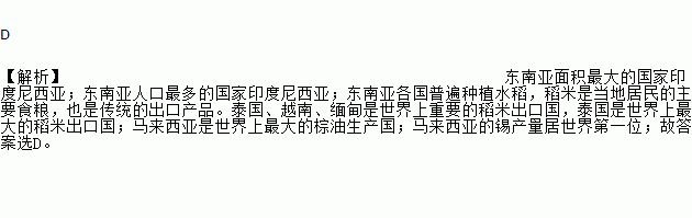 D 【解析】东南亚面积最大的国家印度尼西亚;东南亚人口最多的国家印度尼西亚;东南亚各国普遍种植水稻,稻米是当地居民的主要食粮,也是传统的出口产品。泰国、越南、缅甸是世界上重要的稻米出口国,泰国是世界上最大的稻米出口国;马来西亚是世界上最大的棕油生产国;马来西亚的锡产量居世界第一位;故答案选D。