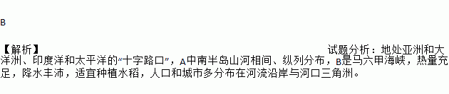 B 【解析】试题分析:地处亚洲和大洋洲、印度洋和太平洋的“十字路口”,A中南半岛山河相间、纵列分布,B是马六甲海峡,热量充足,降水丰沛,适宜种植水稻,人口和城市多分布在河流沿岸与河口三角洲。