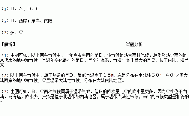 (2)A、B、C、D四种气候是热带的是 ,其中A分布在大陆_____(东岸、西岸),B分布在大陆的________(东岸、西岸),C分布在 (沿海、内陆)。