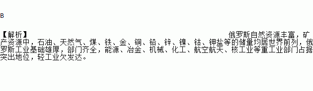 B 【解析】俄罗斯自然资源丰富,矿产资源中,石油、天然气、煤、铁、金、铜、铅、锌、镍、钴、钾盐等的储量均居世界前列,俄罗斯工业基础雄厚,部门齐全,能源、冶金、机械、化工、航空航天、核工业等重工业部门占据突出地位,轻工业欠发达。