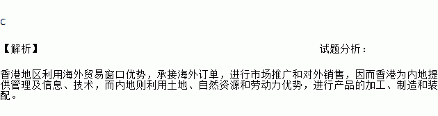 C ¡¾½âÎö¡¿ÊÔÌâ·ÖÎö£º Ïã¸ÛµØÇøÀûÓú£ÍâóÒ×´°¿ÚÓÅÊÆ£¬³Ð½Óº£Íâ¶©µ¥£¬½øÐÐÊг¡ÍƹãºÍ¶ÔÍâÏúÊÛ£¬Òò¶øÏã¸ÛΪÄÚµØÌṩ¹ÜÀí¼°ÐÅÏ¢¡¢¼¼Êõ£¬¶øÄÚµØÔòÀûÓÃÍÁµØ¡¢×ÔÈ»×ÊÔ´ºÍÀͶ¯Á¦ÓÅÊÆ£¬½øÐвúÆ·µÄ¼Ó¹¤¡¢ÖÆÔìºÍ×°Åä¡£