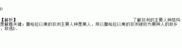 D 【解析】了解非洲的主要人种结构是解题关键;撒哈拉以南的非洲主要人种是黑人,所以撒哈拉以南的非洲被称为黑种人的故乡,故选D.