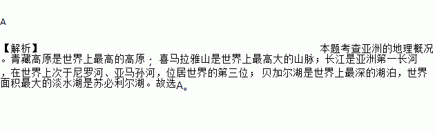A 【解析】 本题考查亚洲的地理概况。青藏高原是世界上最高的高原; 喜马拉雅山是世界上最高大的山脉;长江是亚洲第一长河,在世界上次于尼罗河、亚马孙河,位居世界的第三位; 贝加尔湖是世界上最深的湖泊,世界面积最大的淡水湖是苏必利尔湖。故选A。