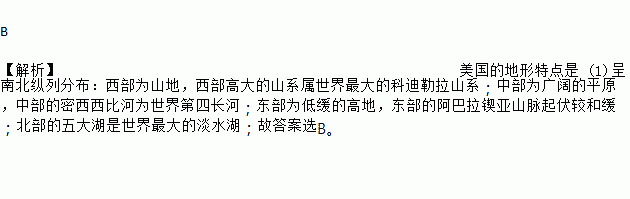 B 【解析】美国的地形特点是 (1)呈南北纵列分布:西部为山地,西部高大的山系属世界最大的科迪勒拉山系;中部为广阔的平原,中部的密西西比河为世界第四长河;东部为低缓的高地,东部的阿巴拉锲亚山脉起伏较和缓;北部的五大湖是世界最大的淡水湖;故答案选B。