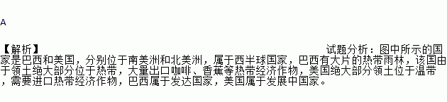 A 【解析】试题分析:图中所示的国家是巴西和美国,分别位于南美洲和北美洲,属于西半球国家,巴西有大片的热带雨林,该国由于领土绝大部分位于热带,大量出口咖啡、香蕉等热带经济作物,美国绝大部分领土位于温带,需要进口热带经济作物,巴西属于发达国家,美国属于发展中国家。