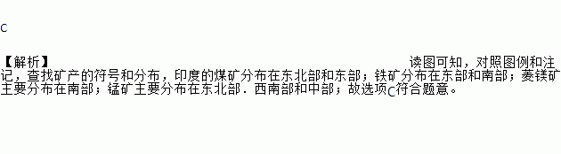 C 【解析】读图可知,对照图例和注记,查找矿产的符号和分布,印度的煤矿分布在东北部和东部;铁矿分布在东部和南部;菱镁矿主要分布在南部;锰矿主要分布在东北部.西南部和中部;故选项C符合题意。