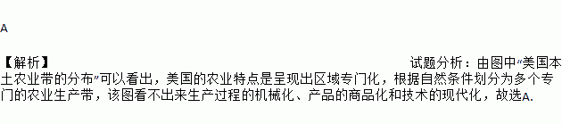 A ¡¾½âÎö¡¿ÊÔÌâ·ÖÎö£ºÓÉͼÖС°ÃÀ¹ú±¾ÍÁũҵ´øµÄ·Ö²¼¡±¿ÉÒÔ¿´³ö£¬ÃÀ¹úµÄÅ©ÒµÌØµãÊdzÊÏÖ³öÇøÓòרÃÅ»¯£¬¸ù¾Ý×ÔÈ»Ìõ¼þ»®·ÖΪ¶à¸öרÃŵÄũҵÉú²ú´ø£¬¸Ãͼ¿´²»³öÀ´Éú²ú¹ý³ÌµÄ»úе»¯¡¢²úÆ·µÄÉÌÆ·»¯ºÍ¼¼ÊõµÄÏÖ´ú»¯£¬¹ÊÑ¡A.