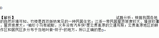 D 【解析】试题分析:根据我国各地的自然环境可知,竹楼是西双版纳常见的一种民居住宅;江浙一带民居屋顶坡度较大、墙体较薄,屋顶坡度大;“袖珍小马有能耐,火车没有汽车快”是云贵高原的交通写照;云贵高原地区的耕作区和居民区多分布于当地叫做“坝子”的地方。所以正确的是D。
