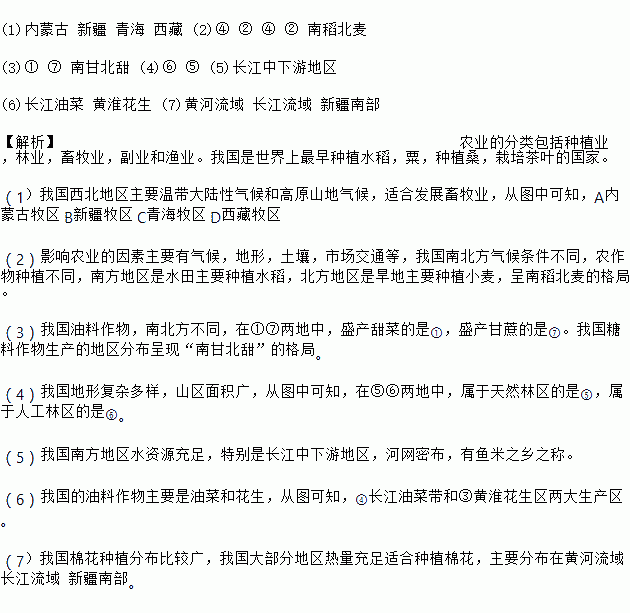 (1)ÄÚÃɹŠÐ½® Çຣ Î÷²Ø (2)¢Ü ¢Ú ¢Ü ¢Ú Äϵ¾±±Âó (3)¢Ù ¢ß Äϸʱ±Ìð (4)¢Þ ¢Ý (5)³¤½ÖÐÏÂÓεØÇø (6)³¤½ÓÍ²Ë »Æ»´»¨Éú (7)»ÆºÓÁ÷Óò ³¤½Á÷Óò н®Äϲ¿ ¡¾½âÎö¡¿Å©ÒµµÄ·ÖÀà°üÀ¨ÖÖÖ²Òµ£¬ÁÖÒµ£¬ÐóÄÁÒµ£¬¸±ÒµºÍÓæÒµ¡£ÎÒ¹úÊÇÊÀ½çÉÏ×îÔçÖÖֲˮµ¾£¬ËÚ£¬ÖÖֲɣ£¬ÔÔÅà²èÒ¶µÄ¹ú¼Ò¡£ £¨1£©ÎÒ¹úÎ÷±±µØÇøÖ÷Ҫδø´ó½ÐÔÆøºòºÍ¸ßÔɽµØÆøºò£¬ÊʺϷ¢Õ¹ÐóÄÁÒµ£¬´ÓͼÖпÉÖª...