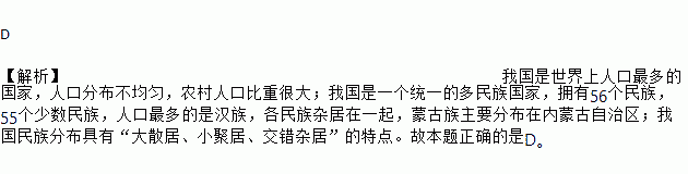 D ¡¾½âÎö¡¿ÎÒ¹úÊÇÊÀ½çÉÏÈË¿Ú×î¶àµÄ¹ú¼Ò£¬È˿ڷֲ¼²»¾ùÔÈ£¬Å©´åÈ˿ڱÈÖØºÜ´ó£»ÎÒ¹úÊÇÒ»¸öͳһµÄ¶àÃñ×å¹ú¼Ò£¬ÓµÓÐ56¸öÃñ×壬55¸öÉÙÊýÃñ×壬ÈË¿Ú×î¶àµÄÊǺº×壬¸÷Ãñ×åÔÓ¾ÓÔÚÒ»Æð£¬ÃɹÅ×åÖ÷Òª·Ö²¼ÔÚÄÚÃɹÅ×ÔÖÎÇø£»ÎÒ¹úÃñ×å·Ö²¼¾ßÓС°´óÉ¢¾Ó¡¢Ð¡¾Û¾Ó¡¢½»´íÔÓ¾Ó¡±µÄÌØµã¡£¹Ê±¾ÌâÕýÈ·µÄÊÇD¡£