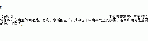D 【解析】 本题考查东南亚主要的粮食作物。东南亚气候湿热,有利于水稻的生长,其中位于中南半岛上的泰国、越南和缅甸是重要的稻米出口国。