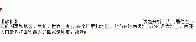 B 【解析】试题分析:人们居住在不同的国家和地区.目前,世界上有220多个国家和地区,分布在除南极洲以外的各大洲上.南亚人口最多和面积最大的国家是印度,故选B.