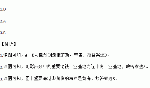 1.D 2.A 3.B 【解析】 1.读图可知,A. B两国分别是俄罗斯、韩国,故答案选D。 2.读图可知,阴影部分中的重要钢铁工业基地为辽中南工业基地,故答案选A。 3.读图可知,图中重要海港①濒临的海洋是黄海,故答案选B。